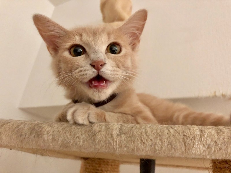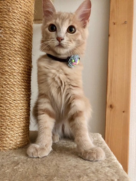 | 特徴(性格など) | まだまたビビりの「テオ」くん♡ 抱っこしたり、自分からスリスリして甘えることできないけど、玩具で遊んで貰うの大好き♪ 大人猫ちゃん大好き♪キャットタワー大好き♪ 人が傍に行くと、びゅーーーん!と逃げますが、一定の距離キープして、しっかり自己主張できるようになりました。 現在、現在、ドライフードを置き餌として、栄養補給のため、一日2回程度のパウチを与えています。 <推定誕生日:7月中旬> |