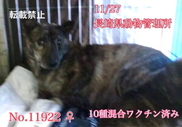 | 特徴(性格など) | まだ4歳位、可愛い黒茶のトラ柄ブリンドル、怖がりさんの女の子が助けを待っています! 長崎県諫早市内にて多頭飼育、広い敷地で放し飼いで餌やりだけされていた子達の中の1匹になります。不妊をせずに頭数が増えて手に負えなくなったとの事で出産した子犬達と一緒に管理所へ持ち込まれました。 (持ち込む時に10種混合ワクチン、フィラリア血液検査→陽性だったので投薬、ノミマダニ駆除のプラクティック投与は済ませてあります。) ※子犬達は無事里親様が決まりました。 生まれてから、一度も首輪もした事が無く、人と一緒にリードを付けてのお散歩もした経験が無い子です。ご飯だけ与えられ、撫でたり触れ合ったり、人からの当たり前の愛情を知らぬまま生きてきました( ; ; ) 親子離れ離れになりますが、でも、そんな環境のままでいたより、良かったと考え、この子の幸せを、温かい本当の家族を見つけたい!と願っております。 人と暮らした経験が無い上に収容され、何もかもが初めての環境になるので無理もありませんが、可哀想に収容当初はとても怖がっていました( ; ; )大人しく臆病で、ひたすらゲージの中でジッとしていて、撫でさせてはくれますが、人前でご飯を食べる事が出来ませんでした。優しい職員さん方が、大丈夫、怖くないよ、幸せになれます様にと、毎日触れ合いながら、一生懸命にお世話してくださっているお陰で、警戒しながらも少しずつ前に出てきたり、やっと担当の職員さんの手から食べてくれる様になったそうです!♡ ご飯を持って行くと舌をペロペロするそうです(^^) でも人に馴れるまではまだ時間を要すると思われます。 見た目の推定になりますが体重は10〜13キロ前後位でしょうか。 まだ若い子ですし、色々不安で怖い事ばかりなのでしょうから、人間が焦らずゆっくりゆっくり長い目で見守りながら、根気よく愛情を持って接すれば、いつかきっと!新しい家庭に馴染んでいけるのでは、と思います。 広い心で長期戦ドンとこい^_^と仰って頂ける方、まだ怯えていて不安気なお顔のこの子を、いつか尻尾フリフリニコニコの笑顔にしてくださる方、いらっしゃいませんか?どうぞ宜しくお願い申し上げますm(_ _)m ⭐️必ず室内飼育で、お早めに避妊手術をする事が可能な、なるべくお留守番が少ない、沢山優しく触れ合っていただけるご家庭。 ⭐️ 首輪、胴輪、リードをつけた経験が無い子です、お散歩の練習はこれからになります! 室内でのトイレの躾も1からとなります。 当分の間は何かと手がかかり大変だと思いますが覚悟と理解で受け入れて下さる方。 ⭐️犬の飼育経験があり愛情を持って犬をしっかり躾することが出来る方、お散歩や運動に充分時間をあてられる方、場合によりトレーニング教室なども視野に入れて考えてくださる方。 何卒宜しくお願い致します。 ※狂犬病予防接種実績はありません。フィラリア治療、避妊手術も含め、譲渡後に里親様にお願いする形になりますm(_ _)m 以上の点を踏まえ、この子の置かれている状況をご理解のうえ、全て受け入れ寄り添っていただけるご家庭で可愛がっていただきたいと祈っております。 収容された全ての子達は身勝手な人間による被害者であり、何も悪くありません( ; ; ) 家族の一員として生涯寄り添いながら大切にしてくださるご家庭とのご縁が結ばれ幸せになれます様に。 1日も早く温かな愛情を目一杯注がれながら、元気に幸せに生きてほしいです。人間より遙かに短い生涯です。 冷たく硬いコンクリートの上、檻の中で、命の期限が迫る中、ひたすら優しい素敵な里親様を待ち続けています。 悲しい事にこの世の中、人間に飼われないと犬は生きていく事が出来ません。 捨てる飼い主、探さない飼い主、医療にかけない飼い主、虐待する飼い主…飼い主を選ぶ事も出来ません。まだまだこれからのこの子を生涯大切に可愛がって下さる優しい素敵な里親様、どうかお願い致します。きっと、必ず最高の家族になります! もうこれ以上悲しい辛い目に遭わせたくありません。本当の愛情、温もりを知ってほしい、辛かった分、寂しかった分、まだまだこれからの犬生はのびのびと幸せいっぱいに愛し愛されて、生きてほしいと願っております。家族の一員に迎え、愛情溢れるご家庭で一緒に暮らして頂けませんか。 何卒宜しくお願い致します(๑•ᴗ•๑)♡ ◆健康状態 ※持ち込む時に10種混合ワクチン、フィラリア血液検査→陽性だったので投薬、ノミマダニ駆除のプラクティック投与は済ませてあります。 管理所では収容するのみ、になり、健康診断などは一切行っておりません。 トライアル制度もございません( ´•̥ו̥` ) 例えどんな病があろうとも、この子の全てを丸ごと受け止め終生愛情飼養して下さる方のみ への譲渡となります事をご了承くださいませ。 何卒宜しくお願い申し上げますm(_ _)m ⭐️収容動物の健康面での保証(性格も収容中に職員が見て接した分かる範囲となります