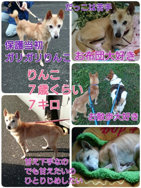 | 特徴(性格など) | ガリガリだった りんこちゃん まだ、保護して1ヶ月くらいなのだけど 少し、お肉ついてきました。 ケージがきらいで鼻をこすって傷ついてたりんこちゃん。 いきなり室内フリーにするのは猫ちゃんとの相性が心配だったので部屋のなかでリードをつけて1週間ほど様子見でした。 急に猫が走って通りすぎると追いかけるけど襲う感じではなく、とっさな動作をされると怖いみたいです。 猫がとなりに座っててもそれはいいらしいです。 最初は抱っこは全然できなくて、触られるのも苦手だったのですが、 ゆっくり撫でてあげれば気持ちいいというのがわかったみたいで いまは、なでなでは大好きになりました。 抱っこも私は慣れたのでできます。 犬同士は散歩のときは誰とでも仲良く行けるのですが、 室内だと、小競り合いがあります。 愛情を独占したいようです。 1度喧嘩して完敗した我が家の秋田犬には従ってますが、他の犬はライバルで 日々、メラメラ小さな小競り合いをしてます きっと、すごく愛情に飢えていた子なんだと思います。 人間に可愛がられたことなんでなかったんだと思います。 なので、まだ色んなことに日々、ためらいもあるけど、ペットシーツでも80%、トイレできるようになったし、室内の生活にも順応してるし、 7歳くらいのわりには協調性もまぁ、あり、1頭飼育、もしくは、りんこより気の強い子となら、飼いやすいかと思います。 ★★★★★★★★★★★★ まだまだ、りんこちゃん、いい子になると思います! ★★★★★★★★★★★★ ちなみに、朝はお布団でまったりしたいらしく、散歩だよーといっても、二階からおりてきません。 ★★★★★★★★★★★★ 初心者向きではないけど、愛情をたっぷり注いで、変身させたい人向きです。 日々、変化してるので、日に日にかわいくなるタイプです。 |