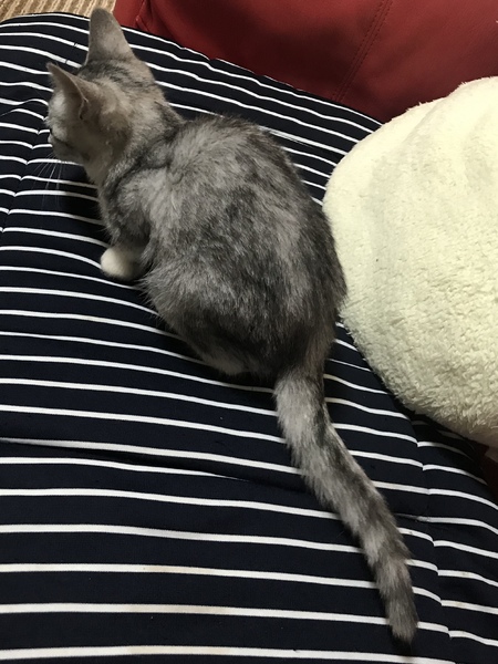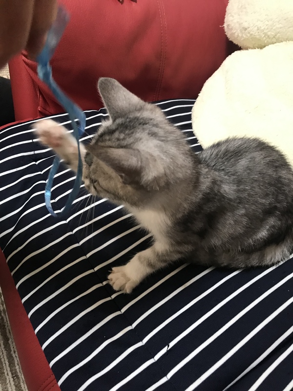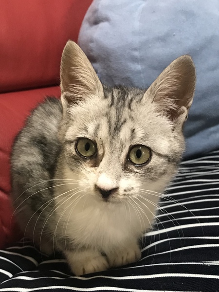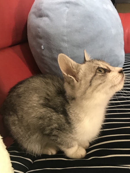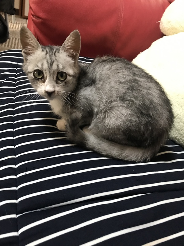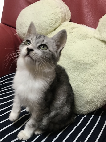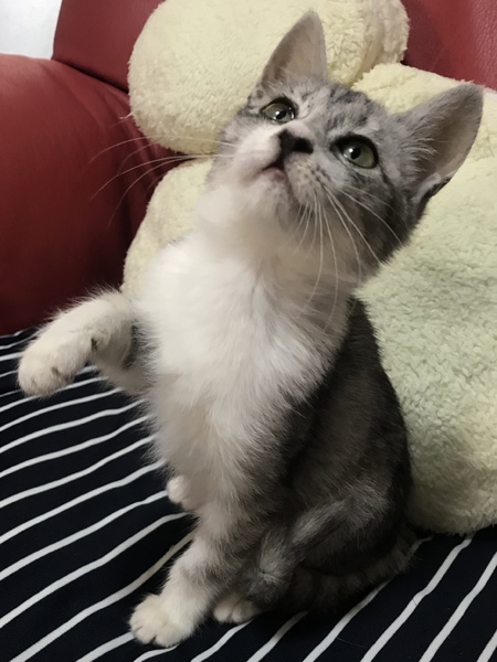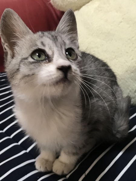 | 特徴(性格など) | サバトラ、しっぽが長い、 胸の毛が白く柔らかでもふもふ まあるい目で見つめられるとキュンキュンです! 人が大好き遊ぶの大好き見てるだけで癒されます とっても良い子です。 |