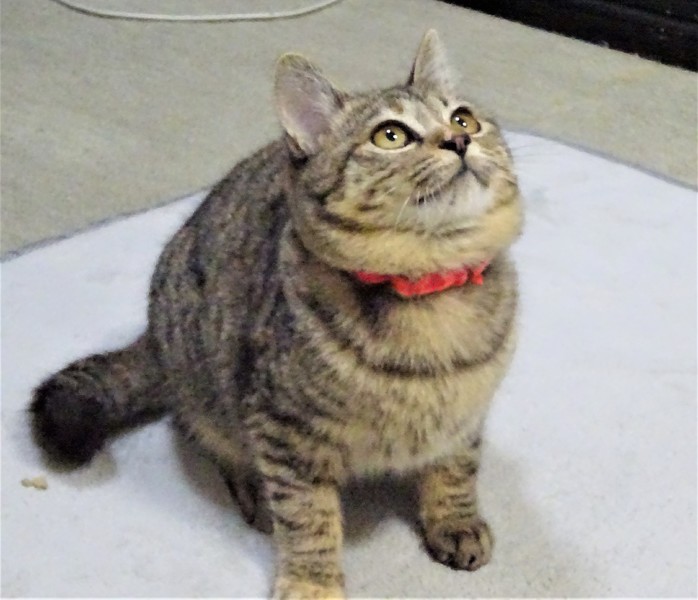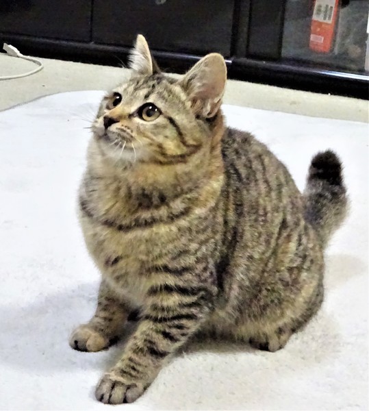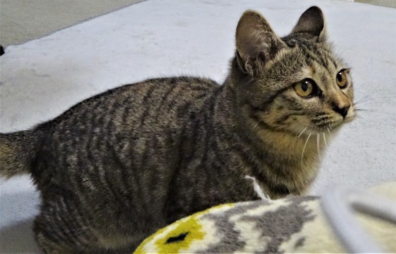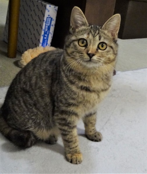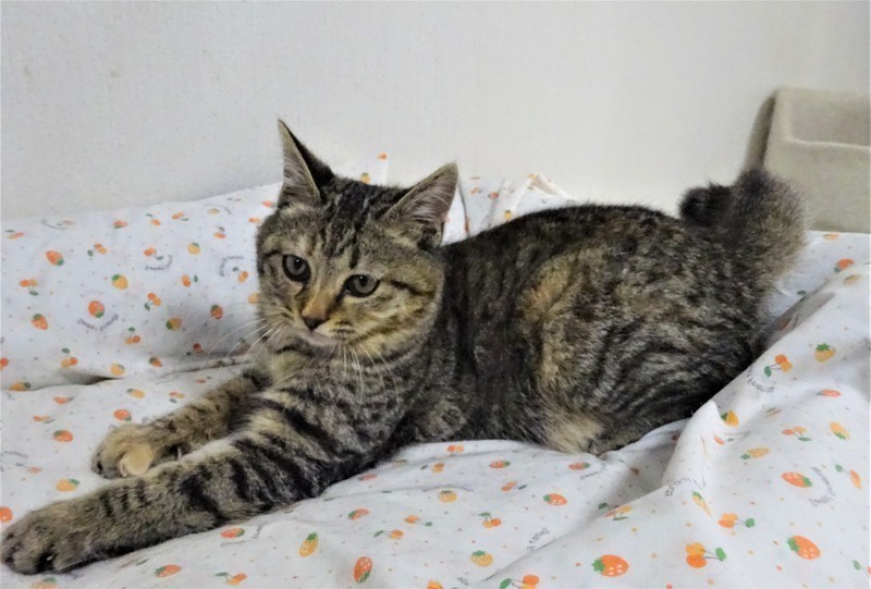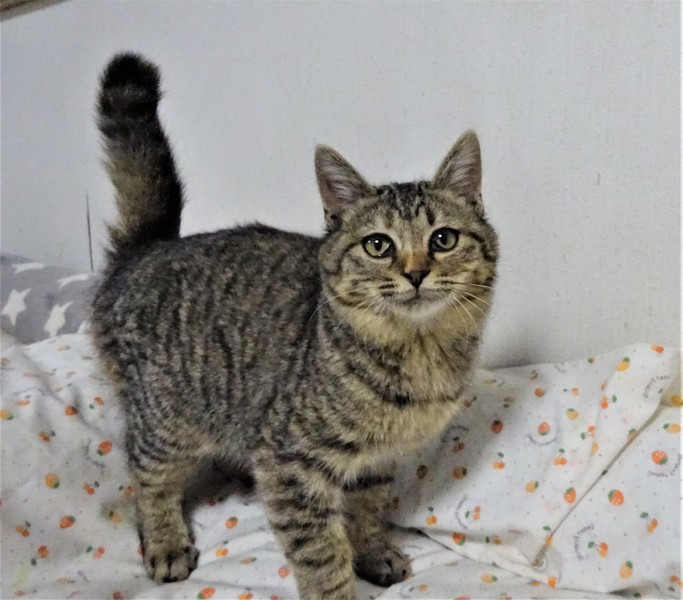 | 特徴(性格など) | 仮名: マギーちゃん(メス) 毛色: キジトラ(所々に茶色模様)、尻尾は太く短め 性格: 威嚇なく、抱っこ出来ます。あまり鳴くこともなく大人しいです。3兄弟のうちの誰かと一緒のお家に行けると嬉しいですが、1匹でも可能です。皆とプロレスというよりじゃらしで遊ぶのが大好きです。おもちゃ遊びも好きで、走ったり、ジャンプしたりしています。 他の大人猫がいても、どちらかというと無関心で、追いかけたりくっついたりはしません。ベッドの中では、エマちゃんの事を良く嘗め回しています。 ノミ取り済 検便済 駆虫済 3種混合ワクチン済 避妊手術済 猫エイズ・白血病ウィルス検査はともに陰性 |