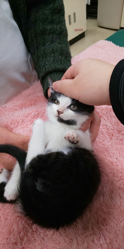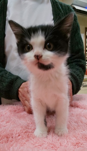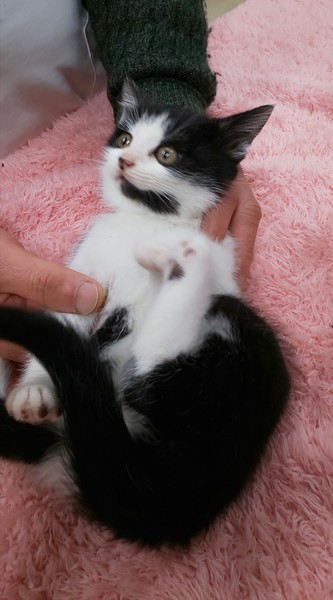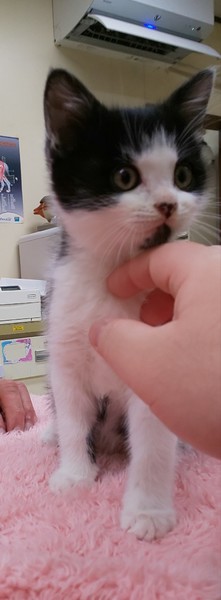 | 特徴(性格など) | 白黒のはちわれ(白多め)の男の子です。 元気いっぱいの食いしん坊です! なでなでが好きでぐるぐるしてくるかわいい子です。 |