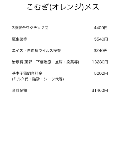 | 譲渡費用(医療費、交通費など) | 3種混合ワクチン 2回 4400円 駆虫薬等 5540円 エイズ・白血病ウイルス検査 3240円 治療費(風邪・下痢治療・点滴・投薬等) 13280円 基本子猫飼育料金 5000円 (ミルク代・猫砂・シーツ代等) 合計金額 31460円 |