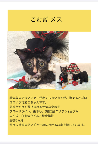 | 特徴(性格など) | ちょっとビビリですが、馴れるととっても甘えん坊になります。 姉妹猫のだいずと一緒に毎日楽しそうに走り回っています。 個性的な顔立ちですが、お目目大きめで可愛らしいです。 |