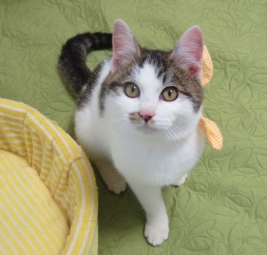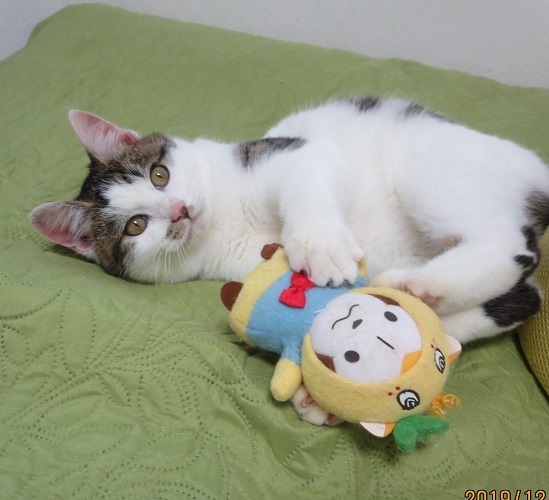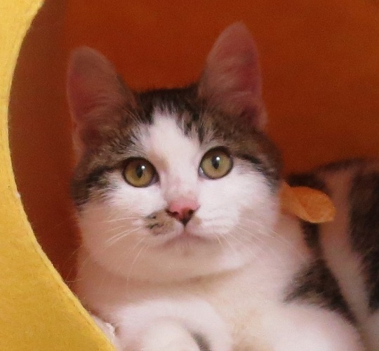 | 特徴(性格など) | 丸い顔でモコモコした毛並、短足でむっちり体型、口元には柄があって、どうと言うことのない子なのですが、何とも味わいのある子猫です。 現れた時から良い子だったそうですが、ご近所で可愛がられ良い子に拍車がかかったのかもしれません(笑) 穏やかな性格、明るくて遊び好き、ネコも好きだけど人がもっと好き。バランスのとれた可愛さと、どこかノスタルジアを感じる雰囲気があって、飼えるものなら飼いたいと思ってしまう、大変に良い子です。 |