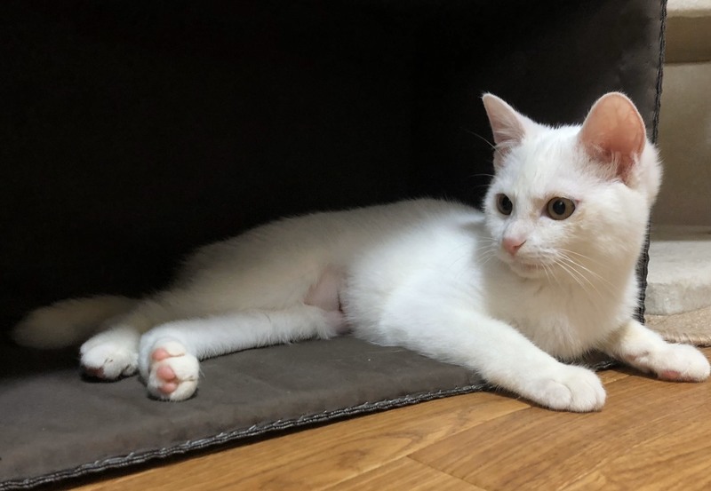 | 特徴(性格など) | 2019.8.1生まれ 毛色:白 全身真っ白でふわふわ綿菓子のような女の子。 真ん丸顔にゴールドの瞳が美しい、妹弟思いの優しいお姉さん。 元気いっぱい遊ぶの大好き!! 特に猫じゃらしがお気に入りで、遊んで~と足元まで持ってきます♡ 子猫も大人猫にも慣れているので、先住さんのいるお家でも大丈夫です! 妹弟猫の もめん・おぼろ もよろしくね♪ |