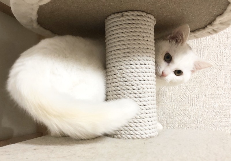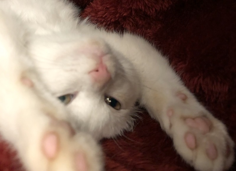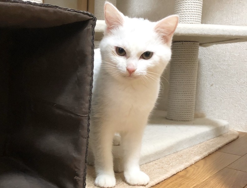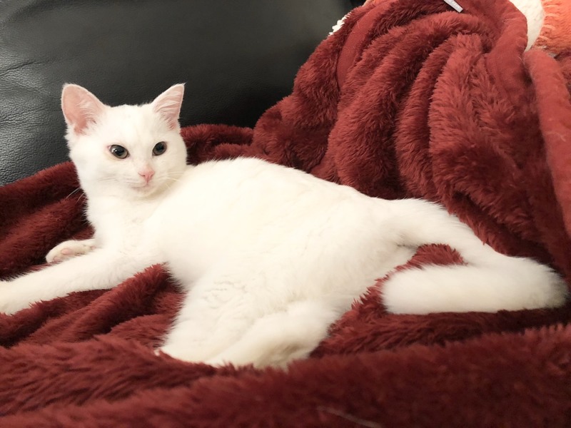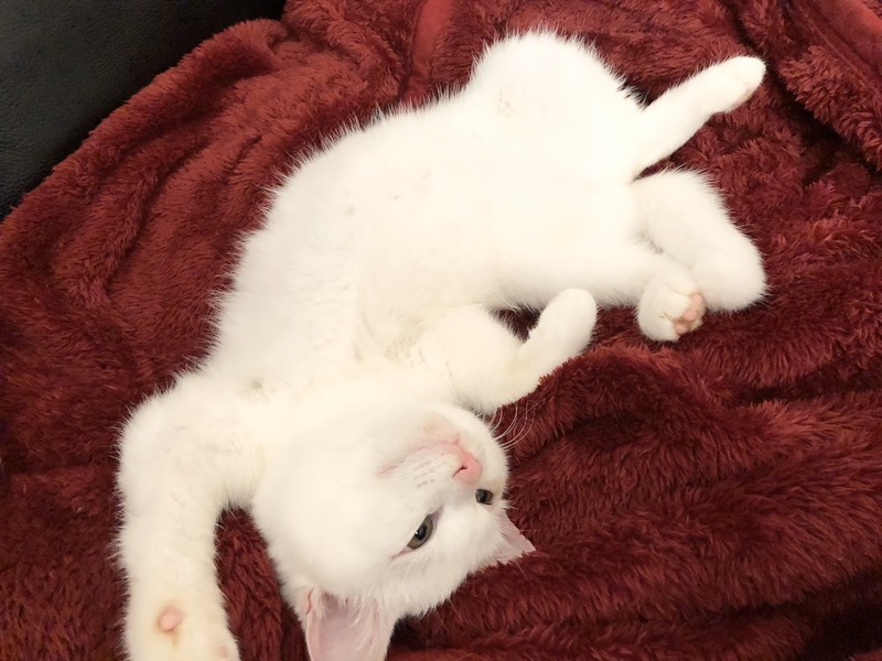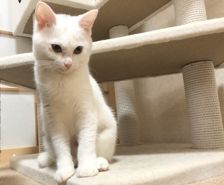 | 特徴(性格など) | 2019.8.1生まれ 毛色:白 真っ白ふんわりマシュマロボディの女の子。 頭のグレー模様がチャームポイント♪ ちょっぴりビビリな性格なので、初めての人にはシャーしちゃうけど、すぐにゴロゴロ甘えん坊に変身します♡ 抱っこ大好き、人に寄り添って眠ります。 初めて猫を飼い始める方にお勧めです!! 姉弟猫の きぬ・おぼろ もよろしくね♪ |