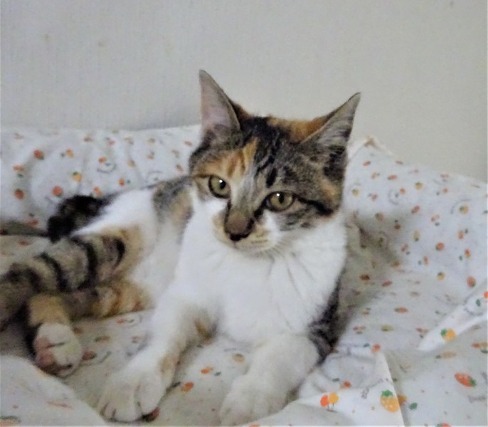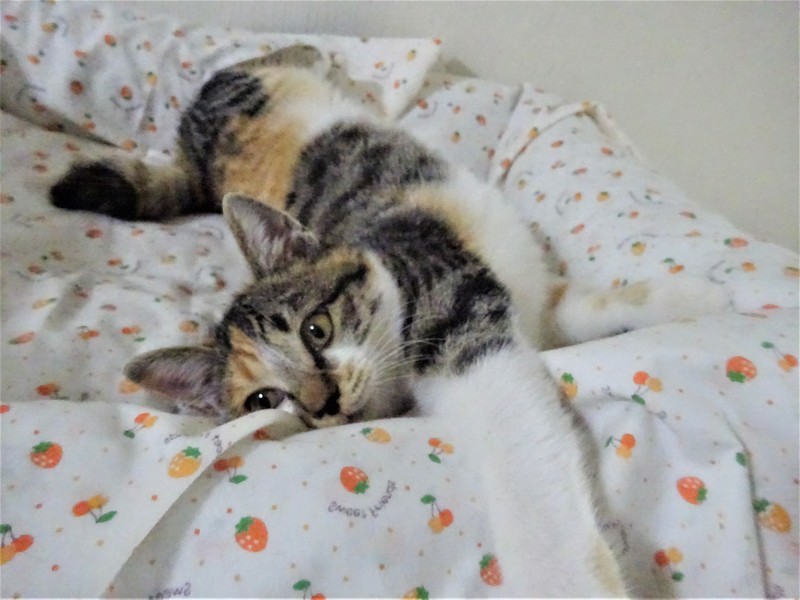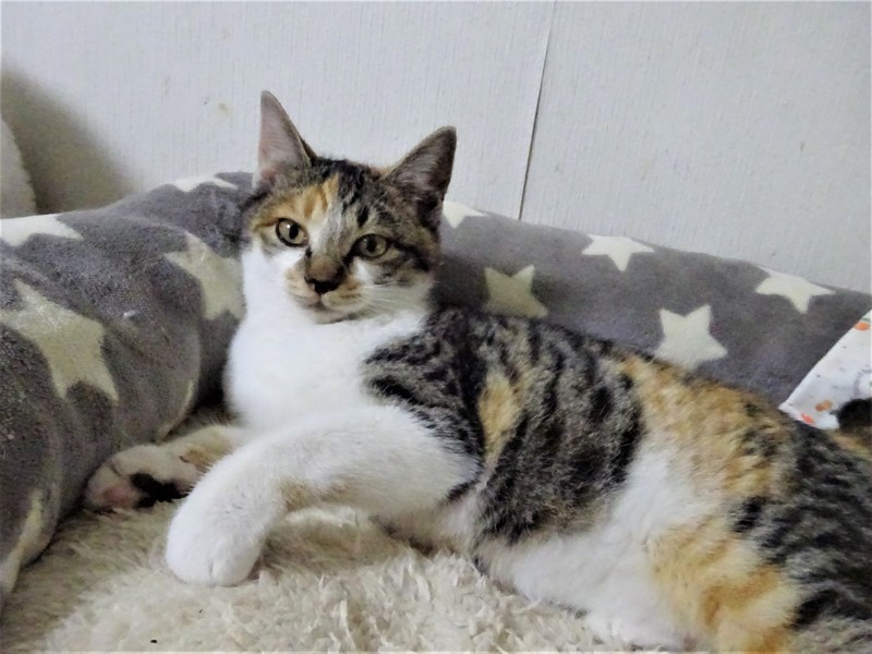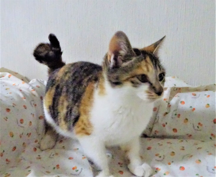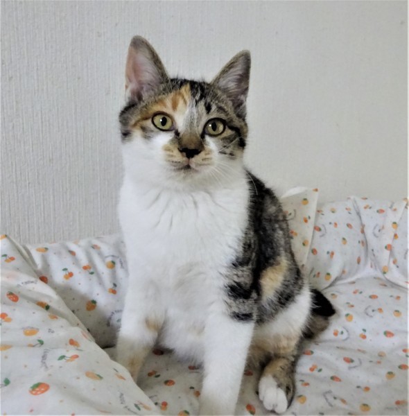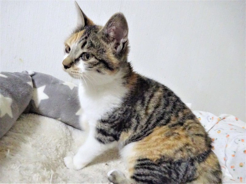 | 特徴(性格など) | 仮名: エマちゃん(メス) 毛色: 淡い三毛キジ、尻尾短い 性格: 保護して間もないうえに、兄弟と一緒にいますので、個性がはっきりとわかっていませんが、少しビビリの所があります。 ただ威嚇なく抱っこ出来ます。兄弟とはよく遊んでいますが、外にいた子なので、毛も密集して、ぷっくりしています。 じゃらしが大好きで燃えます。 今は、走りまくっているので、ケージにいれようとするとなかなか捕まりませんが、自分から入りますので、ケージで寝ています。 兄弟と一緒か、1頭飼いでも大丈夫と思いますが、他の成猫とうまく付き合えるかはまだわかっていません。 ノミ取り済 検便済 駆虫済 3種混合ワクチン済 避妊手術済 猫エイズ・白血病ウィルス検査はともに陰性です |