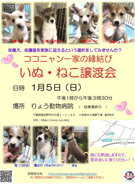 | 特徴(性格など) | 二葉ちゃん、メス、11月4日生まれ とても人懐こくてかわいい子です。 他の兄弟より少し小柄です https://ameblo.jp/coconyanikkanoenmusubi/entry-12563531497.html こちらのページにたくさん写真を掲載しています。ぜひご覧ください。 ワクチン近日接種予定 ノミダニ駆除済 健康状態良好です! 成犬時15キロ前後予想 1月5日、千葉県習志野市で譲渡会参加予定です ぜひ会いに来て下さいませ。 |