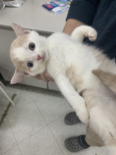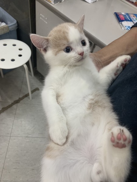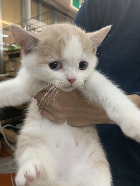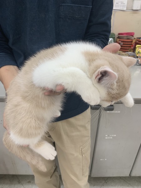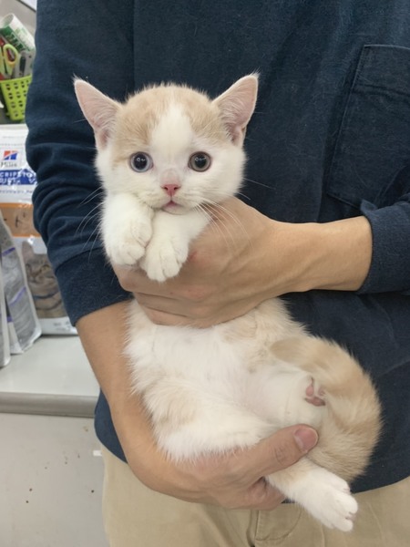 | 特徴(性格など) | 色柄はクリームタビーアンドホワイト。 元気で活発な男の子です。 他の仔猫たちと仲良く遊んでます。 現在は、体の成長と共に頭とのバランスが良くなりつつあります。 良く食べ良く遊びとても元気です。 |