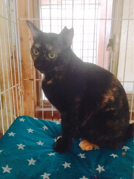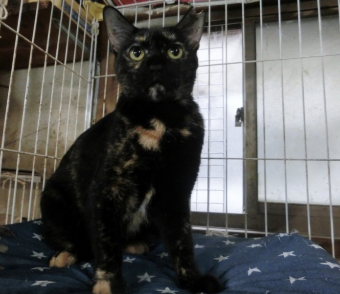 | 特徴(性格など) | 黒にちょっとだけオレンジが混ざった個性的なサビ柄のクゥちゃん。 オレンジまゆげがなんとも可愛いのです^ ^ ナデナデが大好きで甘えんぼです。 クウちゃんは、多頭飼育でもう7年、今も吹きさらしの農具倉庫のケージに入れられたまま過ごしています。ぜひ、暖かいお家にクウちゃんを迎えてあげてください。 7歳ですので、ご高齢の飼い主さんもご検討ください。 |