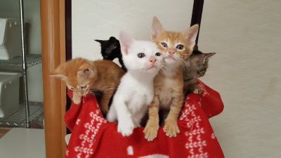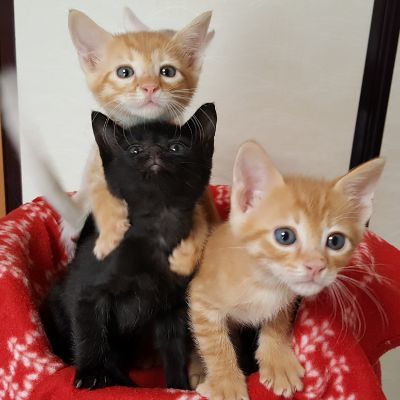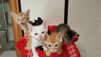 | 特徴(性格など) | 仮に「おかか君」と呼んでいます。体重は1/7現在580gです。 へその緒付、目が開く前から人が育てていますので、人馴れ抜群です。 部屋に入ると、にゃあにゃあと寄って来て、膝に乗ったり、肩によじ登ったり、 ゴロゴロゴロゴロの大音量です。 こんぶ君、おかか君、塩むすび君、小梅ちゃん、しぐれちゃんは兄妹です。 兄妹でお迎え頂ける方大歓迎です。 |