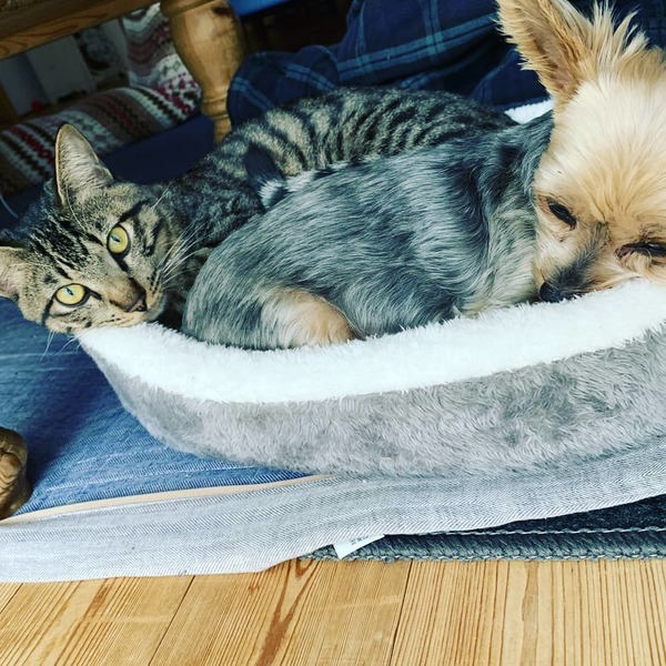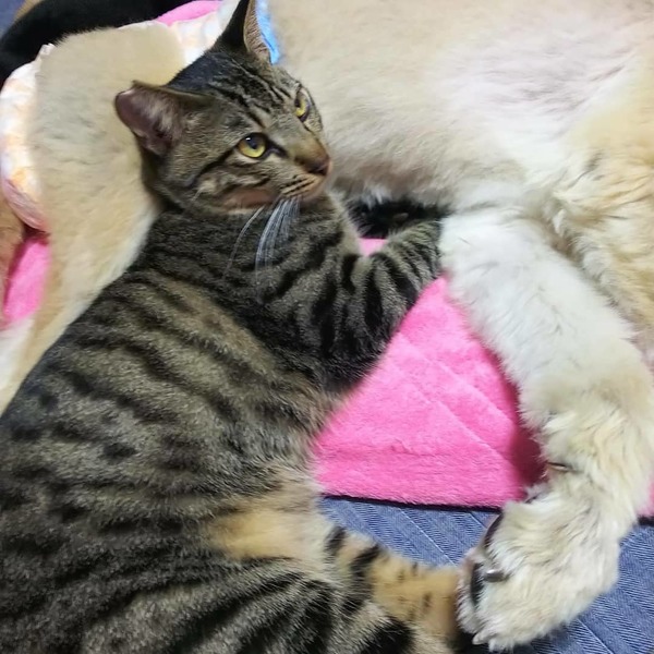 | 特徴(性格など) | トラキジ 保護時、威嚇がすごく全く馴れず、いつも先に嫁いだ兄の後ろをぴったり引っ付いたまま離れずでしたが、約4ヶ月の人馴れ修行を経て、何と今では人にも猫にも犬にも馴れ親しむようになりました。特に同居する弱っている犬に寄り添い、添い寝したり、新たに保護した新参者のお世話をしたりと、今では器の大きい優しい賢いお世話係りとなりました❤️ |