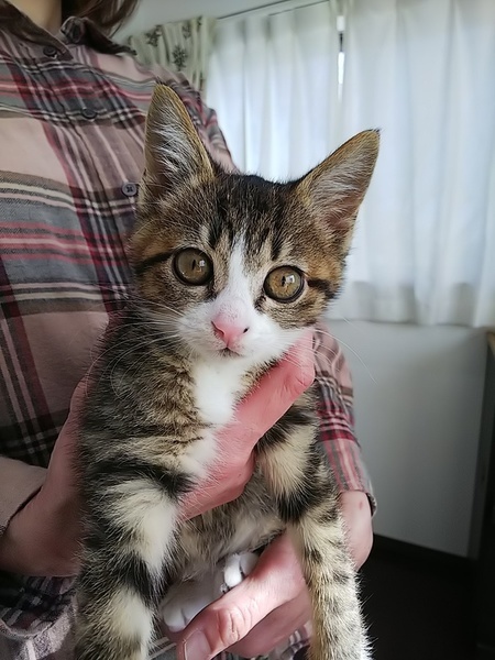 | 里親募集する理由 | 空き家で生まれた子猫を保護しました。三匹中この子以外は亡くなってしまい、一人頑張って生き延びたので、とにかく幸せになってほしいです。 うちで飼えればよいのですが、先住猫が神経質で折合いが悪く、また妻がアレルギーがあり2匹目は厳しく、里親さんを募集します。 とても可愛い甘えん坊の子猫です。 |
