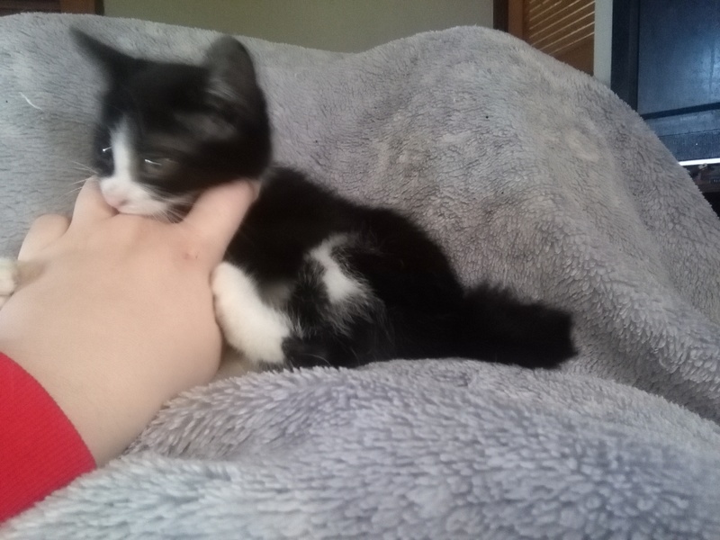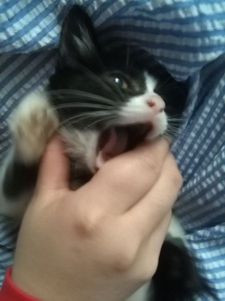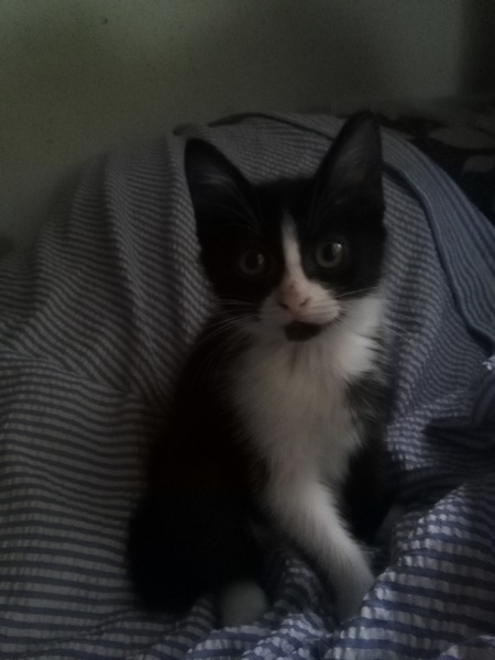 | 特徴(性格など) | 色:黒白 家の駐車場で声を枯らして鳴いてる所を保護しました。 最初は怯えて隠れてばかりでしたが今では慣れてオモチャを食わえて走り回っています! しっぽが渦巻き型で短いです。 犬のようにしっぽをふってよってくるのが堪らなく可愛いです! とにかくヤンチャです! ずっとオモチャを追いかけるか先住猫を追いかけ回してます(*´-`) |