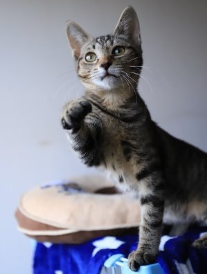 | 特徴(性格など) | 飲み子の時から育てていますので、人は大好きですし、遊ぶのも大好きです。とっても活発でチャーミングなキジトラの女の子。兄弟猫輝光(ねことも募集猫)とは大の仲良しです。いつも2匹でくっついています。 乳飲み子から育てて12月半ばまで風邪ひとつ引いたことがなかったのですが、ほかの保護猫が入ってきたため猫風邪をひき、特に目の腫れがひどかったので数回、インターフェロンや抗生剤で治療しています。現在は健康そのものですが、ご飯はちょび食べです。 |