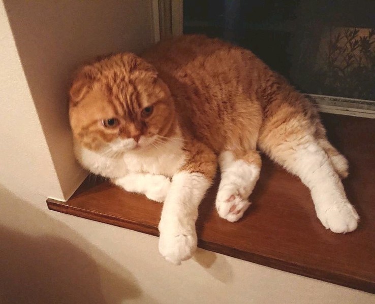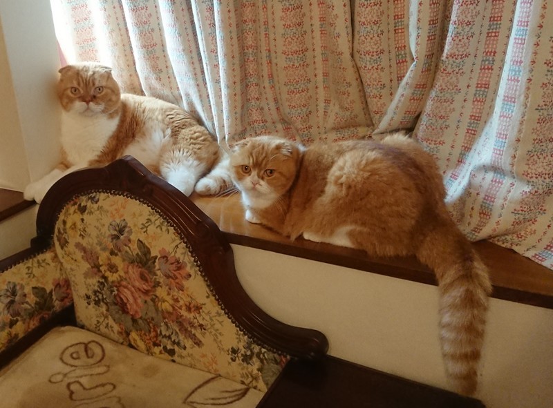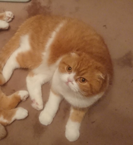 | 特徴(性格など) | スコティッシュフォールド レッドタビー×ホワイト オス6歳、メス6歳 健康優良 オスはとても甘えん坊で、少し気が小さいです。 メスは人なつこく好奇心旺盛です。 どちらの子も性格が良く、人が大好きです。 同い年で仲良しですが兄弟ではなく、別々のペットショップで買った子たちとなります。 |