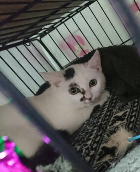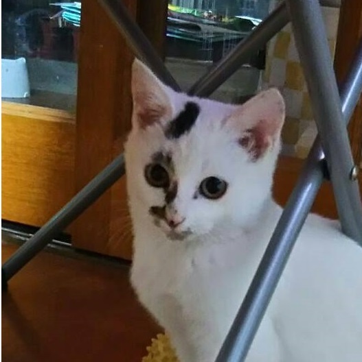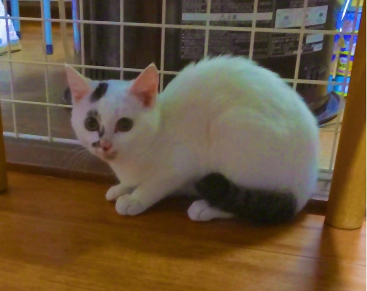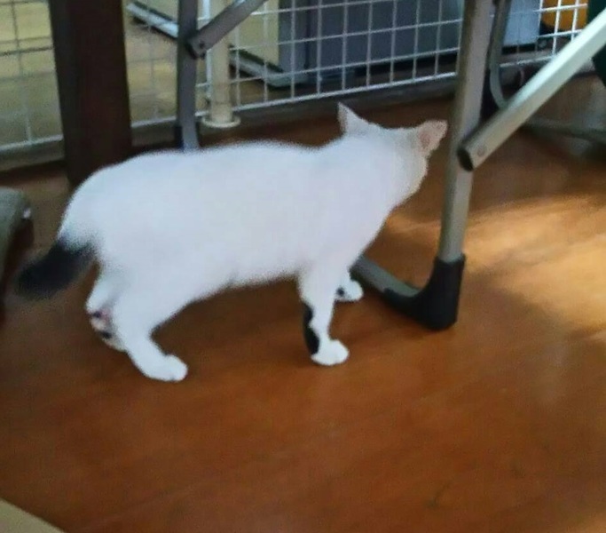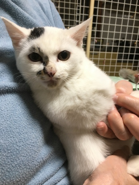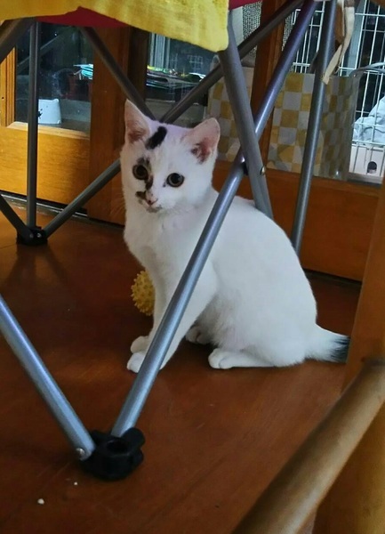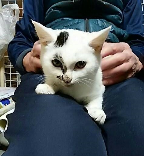 | 特徴(性格など) | 仮名)ノン 身体は真っ白で顔としっぽに黒い柄ははいっていて とても個性的なオンリーワンな男の子です。 ちょっとビビりですが保護主には慣れています。 家の猫とはよく遊んでいますので先住猫さんがいても大丈夫です。 |