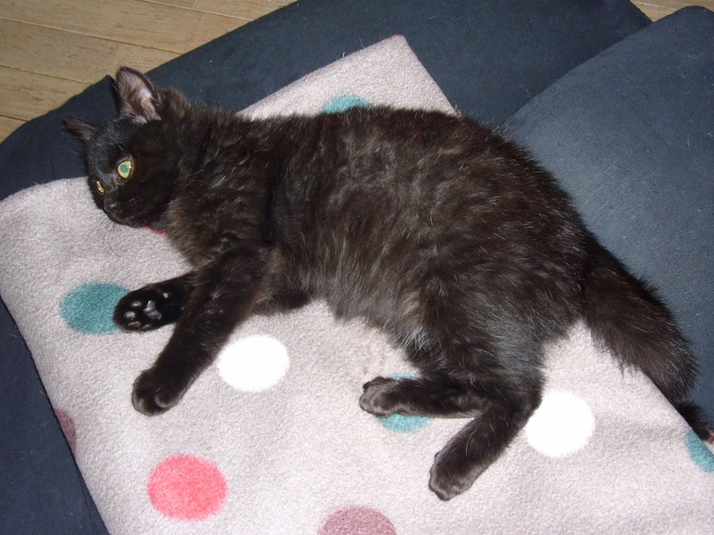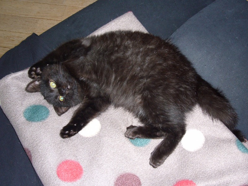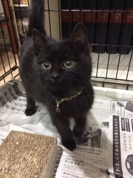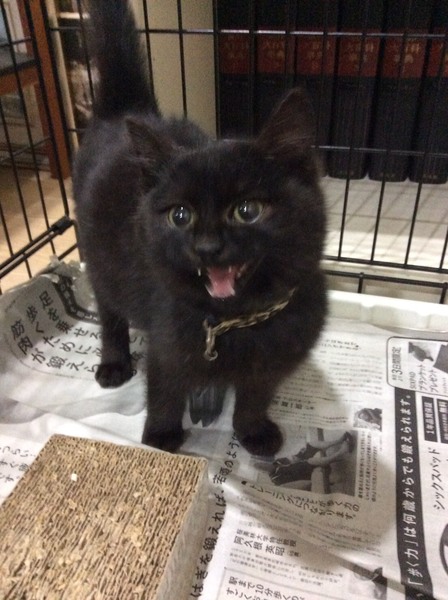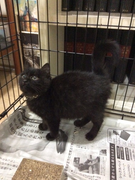 | 特徴(性格など) | 少し茶色かかった黒猫です。 手足は短めで、お顔は丸いです。 毛は半長毛で、目はイエローの中に緑も見えます。 体重1.6キロ 風邪気味でしたので、投薬で治療中です。 性格は人馴れしてて、猫が大好きです。 |