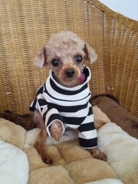 | 特徴(性格など) | トイプードル 色:レッド 名前は、ルイくん 体重 1.6kg ワクチン 接種済み レボリューション 済み 去勢手術は近日中におこないます 心雑音 問題なし パテラ 左グレード3 とても小さくて大人しく、怖がりさんです。 吠えたり咬んだりはしません。 小さなお子さんの居ないご家庭を希望。 フードは、ふやかしてウェットフードをトッピングしています。 |