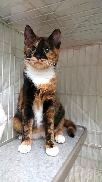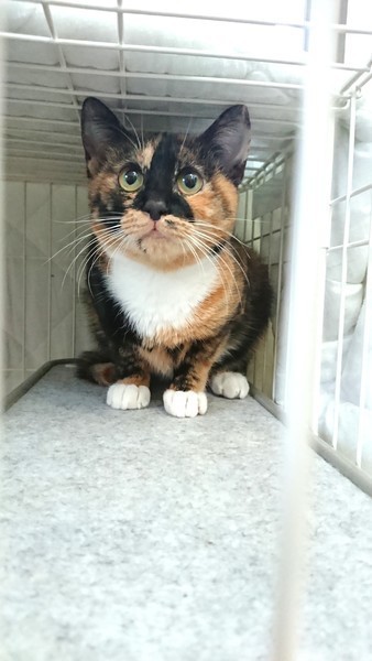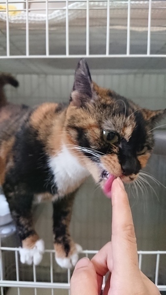 | 特徴(性格など) | 手足が白いソックスを履いたような三毛猫です。 保護した当初はシャーシャー言っていましたが、現在は抱っこもできてごはんもおやつもおねだりできます。 気長に慣れるまで待っていただける方、よろしくお願い致します。 |