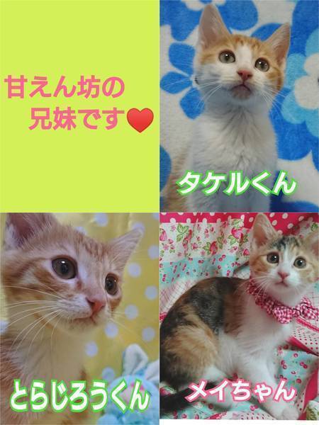 | 特徴(性格など) | 1月26日(日)12:00~16:00(最終申込15:30) ねこざんまい譲渡会に参加予定です! 《会場のご案内はこちら》 https://ameblo.jp/neko3mai/entry-12566897184.html 希望の猫ちゃんがいる場合は、12時に会場へお越し下さい。 先着順ではございませんが、同じ猫ちゃんに複数名のご希望者さまがいらっしゃる場合は、12時半でお見合い受付を締め切らせていただく場合がございます。 ※譲渡会ご来場につきまして、事前予約は不要です どうぞご家族みなさまでご来場下さい♪ ★★★ご来場前に必ずご確認下さい★★★ 《里親様へお願いはこちら》 http://www.neko3mai.com/condition/condition.html 《家族募集中猫ちゃん一覧はこちら》 http://www.neko3mai.com/entrycats/entrycats.html ◆ 名 前 ◆ とらじろうくん ◆ 年 齢 ◆ 約3ヶ月~3ヶ月半 ◆ 性 別 ◆ 男の子 ◆性格は?◆ 可愛い茶トラの男の子、とらじろうくん。 足先は可愛い白足袋を履いてます♪ やっぱり茶トラ! ゴロゴロの甘えん坊さんです。 1匹になるとピーピー泣いてしまうので、仲良し兄妹のメイちゃん・タケルくんのどちらかと一緒にお迎えいただけると嬉しいです。 仲良し兄妹と一緒に楽しく遊んでおります。 食欲旺盛で元気いっぱいです! ペットではなく、共に暮らす家族の一員としてお迎えくださる留守番時間のない(短い)ご家庭を希望しております。 譲渡会はお見合いの場です。 お世話してくださるご家族の皆様、またはご夫婦ご一緒に会いにいらしてくださいね! 脱走や危険防止対策にご理解・ご協力いただけないご家庭への譲渡は、大変申し訳ございませんがご遠慮させていただいております。 |
