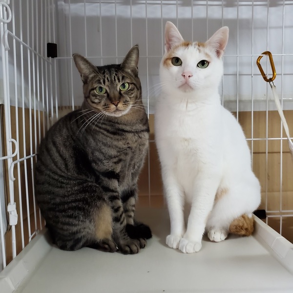 | 里親募集する理由 | キジトラの子は女の子でおあらちゃんと呼んでいます ひどい怪我とヘルニアで腸が腹膜からお腹の皮に出てしまい 保護してすぐに大きな手術をしました 全く慣れていませんでしたが今は撫でたりお尻をポンポンされると 喜ぶようになりました。抱っこはできません 新しい環境では怖くてしばらく唸ると思います あまり風邪もひかず元気な子です 茶シロの男の子はたけぞう君 外ではなわばり争いにいつも負けて怪我ばかりしていた弱虫君です 雄猫とは仲良くできない事が多いので雄猫の先住猫さんがいると難しいかもしれません 最近はあまり鳴かなくなりましたが、新しい環境では大きな声で 鳴くような気がします 抱っこができますがすぐに降りようとします 風邪をひきやすい子です |