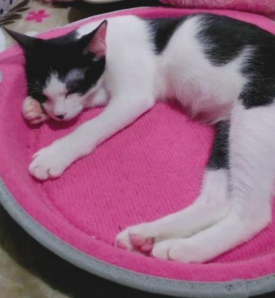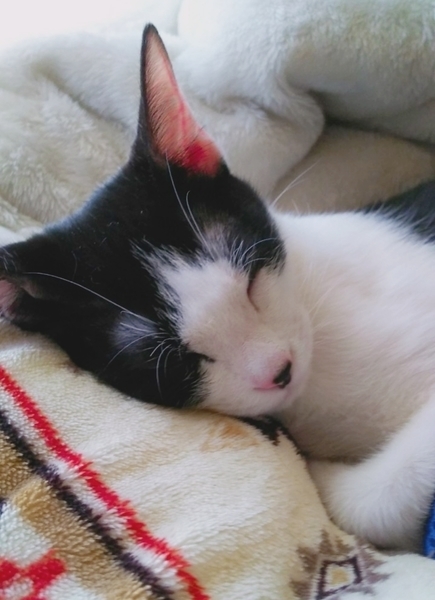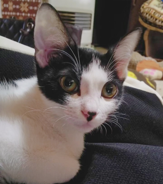 | 特徴(性格など) | 2019.8.22生まれ(推定) 毛色:白黒 少しおっとりな男の子。 好きな場所はお膝の上♡ お鼻の真ん中の黒い素敵模様がチャームポイント♪ 人も猫も大好きで、兄妹のラム、一緒のお家で過ごしているレイたんと一緒に仲良く3匹でピョンピョンと遊んでいます。 |