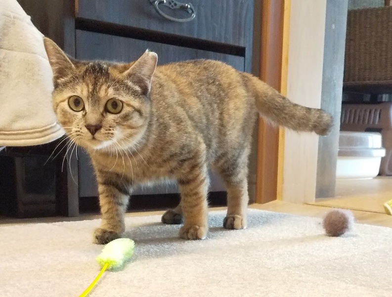 | 特徴(性格など) | 【毛色】ムギワラ 【性別】女の子 【月齢】生後6ヶ月 【仮名】茶豆 【性格】人に甘えたい気持ちはありるものの、素直にスリスリできず、後をついてきたり、近くで横になるなど、不器用に人を誘う姿がいじらしい女のコです。人と遊ぶことが大好きです。猫じゃらしをみたら走って寄ってきます。抱っこは好きではないけれど、爪切りやおやつの時はお膝でおとなしくできるお利口さん。まだ、急な動きには驚いてしまいますが、撫でられる事は好きになってきました。 猫に対しては、優しい猫とは猫団子で眠り、嫌がる素振りをされたらスッと身を引く、など猫としての社会性が身についており、我が家の大人の猫とも仲良く平和に共存しています。猫同士追いかけっこもするし、一人でも遊べます。 |
