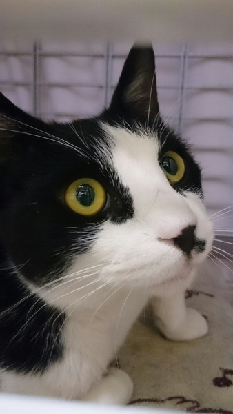 | 特徴(性格など) | 2018.6.30生まれ(推定) 毛色:白黒 おめめの隈取りとお鼻の素敵模様がチャームポイントな、のぶ君。 キリリとしたお顔をしていますが、中身はとっても甘えん坊のかまってちゃん♪千葉支部のおしゃべり部門でイチニを争う陽気な男の子です! そしてとっても食いしん坊!! ゴハンあげるのを忘れたっけ?と思うほど、あっという間に完食です。 抱っこしての爪切りもOK。 |
