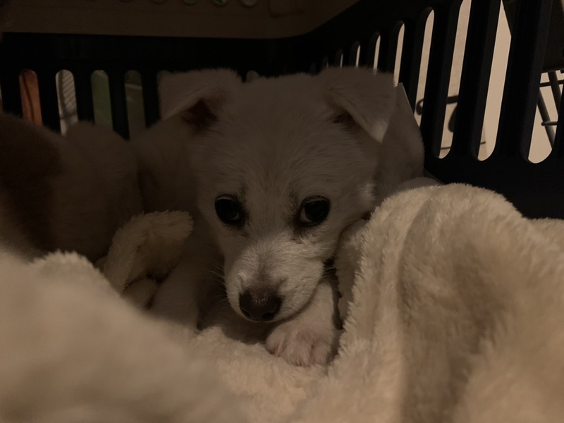 | 特徴(性格など) | 白い子犬です びびりっこで、固まっています 人が怖くてたまらなくて、気配をけしてます |