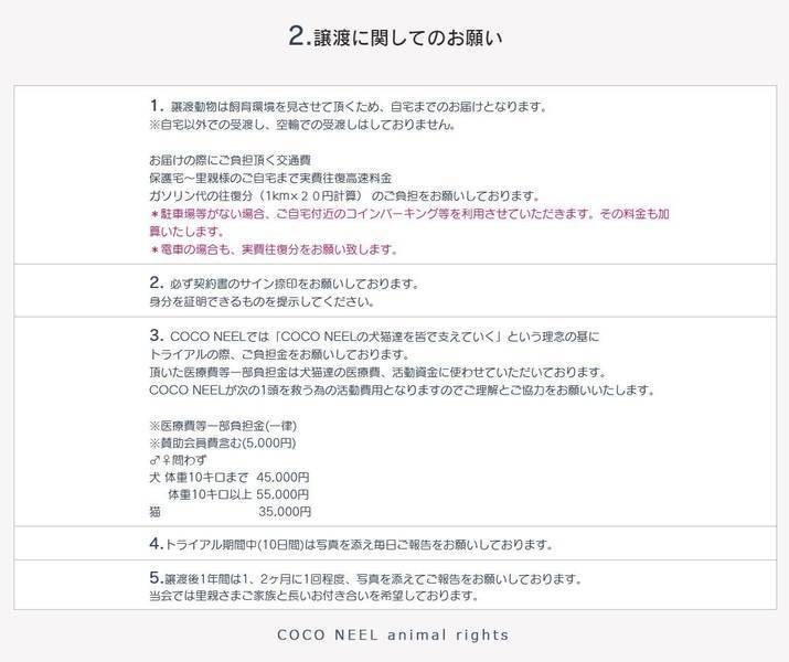 | 譲渡費用(医療費、交通費など) | 医療費、賛助会員費一律 45,000円 別途トライアルお届けの際の往復実費交通費をお願いしております。 |