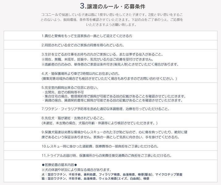 | その他(譲渡条件など) | ✱応募方法✱ ※いつでも里親募集中からのご応募は受け付けられません。 里親希望の方は、以下のURL又は画像に記載の『譲渡のまでの流れ』『譲渡のルール・応募条件』『譲渡に関してのお願い』のご確認のうえ、『里親希望エントリーフォーム』よりご応募お願い致します。 ※お返事には1週間程度のお時間が掛かる場合があります。 『譲渡のまで流れ』 https://coconeel.wixsite.com/website/bosyunonagare 『譲渡に関してのお願い』 https://coconeel.wixsite.com/website/blank-4 『譲渡のルール・応募条件』 https://coconeel.wixsite.com/website/blank 『里親希望エントリーフフォーム』 https://coconeel.wixsite.com/website/entry ※ご質問等ある場合は、フォームの最後の欄にお書き添えください。 ※先着順ではありません。 犬の性格・年齢・病気等を考慮し、多方面から検討させていただきます。 |