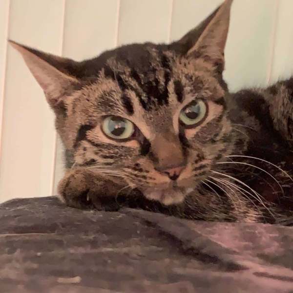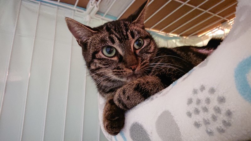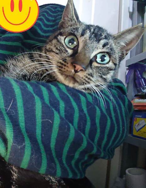 | 特徴(性格など) | 仮名:ロキシー 色柄:アメショっぽい縦じま模様 お目目の色は、サクマドロップのメロン味のようなきれいな薄緑色です。 性格:とてもおとなしくて、のんびり、まったり、超マイペースです。 少し怖がりなところもありますが、バッと逃げたりせず、 じっと固まって動けなくなるタイプ。 |