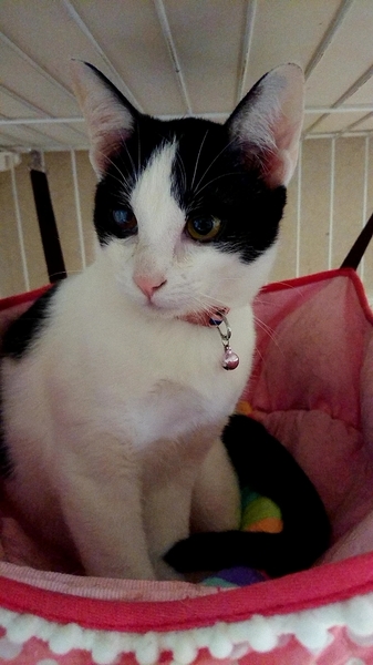 | 特徴(性格など) | とても人慣れしています。遊び大大好きで、とても活発です。 保護したとき、片目を負傷しており治療しましたが、真ん中が白く濁っています。 |