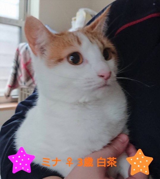 | 特徴(性格など) | 仮名:ミナちゃん 毛色: 白茶 性格:一番慎重派、周りをよく観察してから動くタイプ。 性格がそっくりなので、おそらく姉妹だと思われます。 人懐っこくて、3匹ともみんな優しい性格です。 何処でもさわらせてくれます。 エイズ・白血病ウイルス検査陰性 ワクチン接種済み ノミダニ駆除済み 便検査済み トイレしつけ済み 不妊手術済 前の飼い主さんから飼育放棄されました。 家族として迎え、生涯を共にして下さるお家、ご家族全員が脱走防止対策の意味を理解し行動できるお家とのご縁をお待ちしています。 |