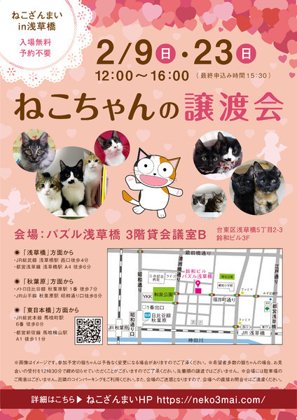 | その他(譲渡条件など) | ★仔猫ご希望の里親様★ 仔猫ちゃんたちは、まだ体がしっかりしていない赤ちゃんです。 下痢だけでも数時間対応ができなかっただけ死に至る事もあります。 その為、月齢に応じたお留守番時間を設けさせていただいております。 また、子猫ちゃん(6ヶ月未満)の里親様には子猫支援金のご協力をお願いいたしております。 ★猫ちゃんとのお見合いは譲渡会で!★ ねこざんまいの猫ちゃんは譲渡会でのお見合いのみとなります。 『この子はいつ譲渡会に参加するの?』『譲渡会場の場所はどこ?』など はねこざんまいホームページをご覧ください。 https://neko3mai.com/ ★楽しく猫ちゃんと触れ合って♪★ ねこざんまい譲渡会は、猫ちゃんも里親様も保護主も笑顔で過ごせる譲渡会を目指しています。 これから20年以上、楽しい時も、悲しい時もいつも傍にいてくれる大切な家族になる猫ちゃんです。 会場には沢山の猫ちゃんがいます。 1匹1匹、触れ合って猫ちゃんとお話ししてください。 『初めて猫ちゃんを家族に迎える方』 『先住猫ちゃんのお友達を迎える方』など トライアルの仕方や先住猫ちゃんと仲良くなるコツなど経験豊富な保護主やスタッフにお気軽にご相談ください! 猫を愛し、そして猫に愛されている猫好きスタッフと保護主がアドバイスさせていただきます。 ★里親希望のみなさまへ★ ペットではなく、家族一員としてたっぷり愛情を注いでくださるご家庭をお待ちしております。 恐れ入りますが、 ・学生の方 ・一人暮らし、同棲中の方 ・子猫、若猫希望の60歳以上のみのご家庭 ・脱走防止対策にご協力いただけない方 は原則お断りさせていただいております。 ただし、預かりボランティアさんとして新しい家族が決まるまでの間、猫ちゃんを預かっていただく道もございます。 参加猫ちゃんは、それぞれ保護主(実際に猫ちゃんを自宅に入れ、保護をしている方)が異なります。 詳しい条件なども異なる場合がございますので、会場内で直接保護主とお話ください。 〖共通条件〗 1.終生飼育 2.完全室内飼い 3.脱走防止対策へのご協力 4.避妊去勢手術 5.契約書類へのサイン 6.定期報告 7.医療費等の負担 当日の猫ちゃんを連れて帰ることはできません。後日、保護主が里親様のご自宅までお届け致します。 その為、移動の際の猫ちゃんの負担を月齢などから考慮し、お届け地区を限定させて頂くこともございますのでご了承ください。 |