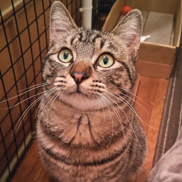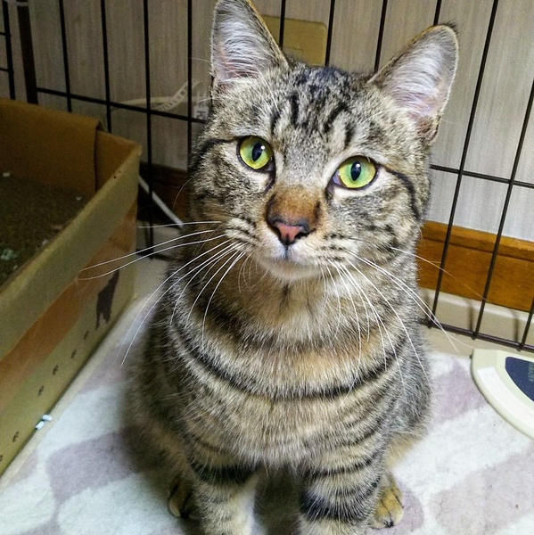 | 特徴(性格など) | 人馴れ抜群のコロッケは、4キロある元気な男の子。血液検査も猫白血病、猫エイズ共に陰性。病院で診ていただき、歯の様子から8~9ヶ月位と言われました。猫も人も大好きなコロッケ。体が大きいので一緒に遊んでもらえる元気な先住にゃんこちゃんがいるお宅、もしくは一人っ子でお迎えいただけるお宅を募集中です。 しっぽは長いです。 |