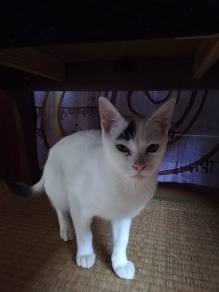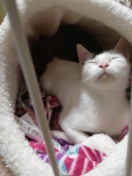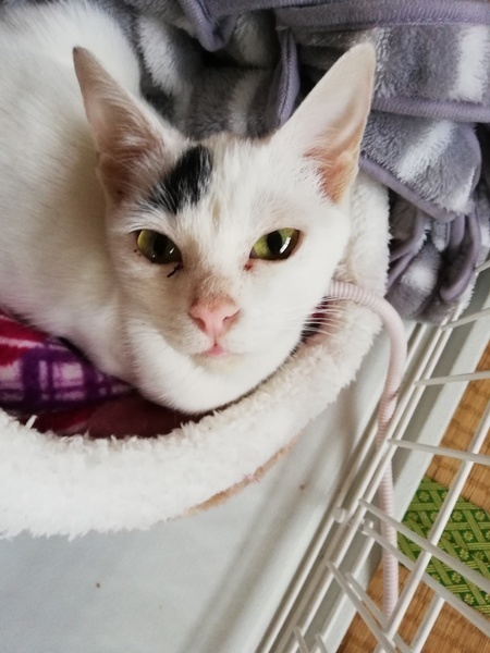 | 特徴(性格など) | 頭に三日月のような黒模様と、尻尾が黒色で身体全体は白色 身体が小さく、子猫のような愛くるし感じです 性格はおとなしめで、撫で撫でが大好きな人懐っこい猫ちゃんです✨ ノミ、ダニ駆除済み ウイルス検査(エイズ白血病陰性証明書あり) 避妊手術済み |