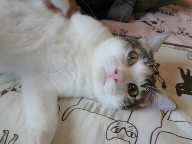 | 特徴(性格など) | なつっこいキジ白の男の子です。 背中には、ハート型(?)の模様が入ってます。 小首をかしげる姿がものすごく可愛く、メロメロになっちゃいます。 おっとりした性格なので、他の猫とも仲良くできます。 食事:ドライフード トイレ:失敗なし 爪切り:できます エイズ・白血病:陰性 |