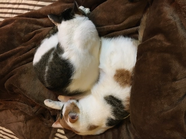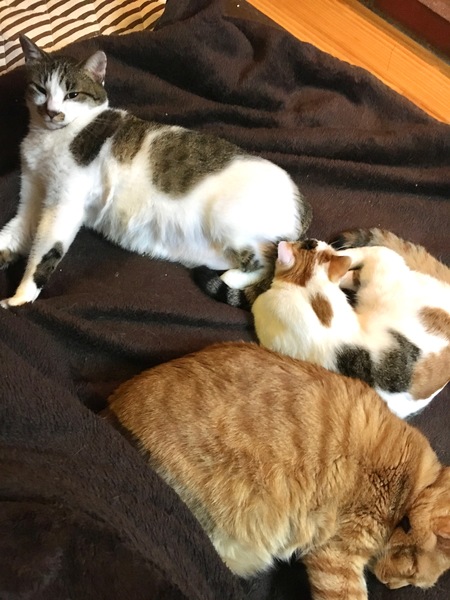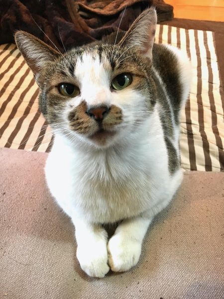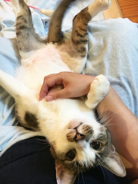 | 里親募集する理由 | 2018年5月、庭のトラップに入りました。ケージでやさぐれ、ケージを壊そうと噛んで自分の鼻の辺りを擦り剥きました。3ヵ月で人間が好きになりました。 遊び好きで、2019年12月に捕獲した三毛ちゃん(オータムちゃん)の心をほぐしてくれています。 三毛ちゃんの人慣れの為にも2頭一緒にお迎え頂きたいと思います。 |