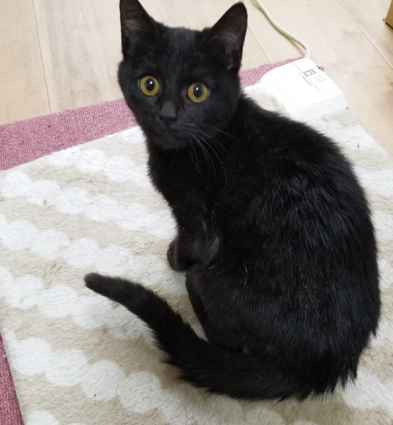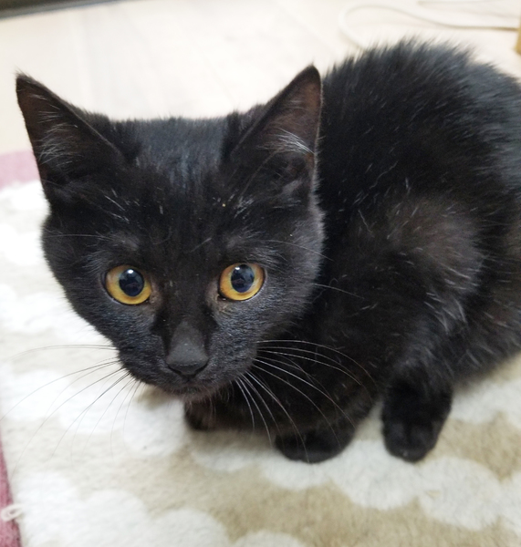 | 特徴(性格など) | 血液検査:陰性 ノミダニ駆虫済み ワクチン5種:接種済み(1回目) 黒猫子猫 四ヶ月くらいです ご飯を食べる時には膝の上に乗ってきて催促します。 好奇心旺盛ですが、新しい場所には慎重派です。 最初からトイレの失敗もなくお利口でした。 |