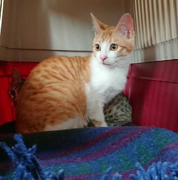 | 特徴(性格など) | ほぼ茶トラと白ですが、顎の下に黒がほんの少し入っています。 性格は大変甘えん坊さんです、慣れてしまえば、抱っこ大好き、ゴロゴロ喉を鳴らします。 食欲良好、元気です。3匹兄妹の内の一匹です。 まるこさんと姉妹です |