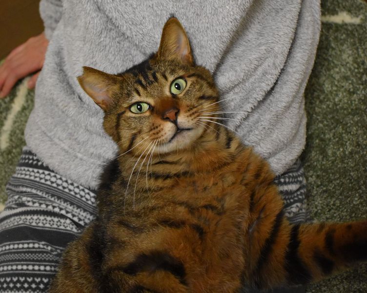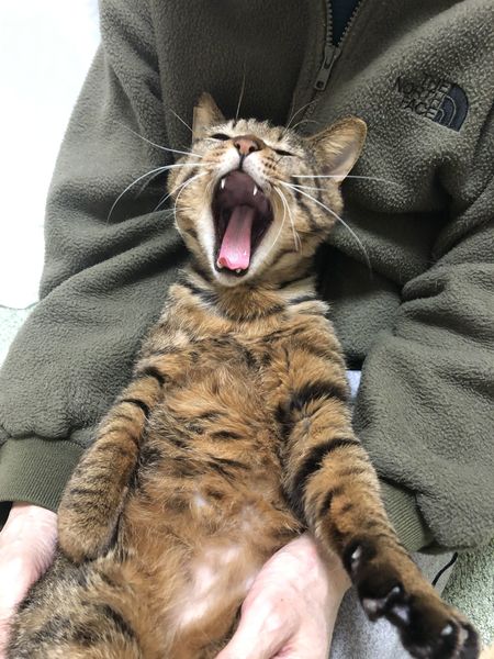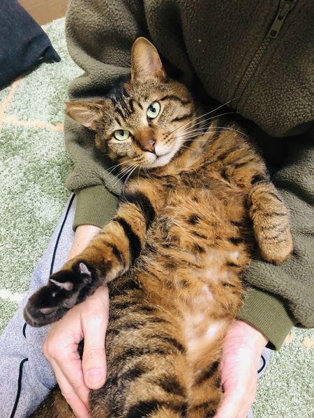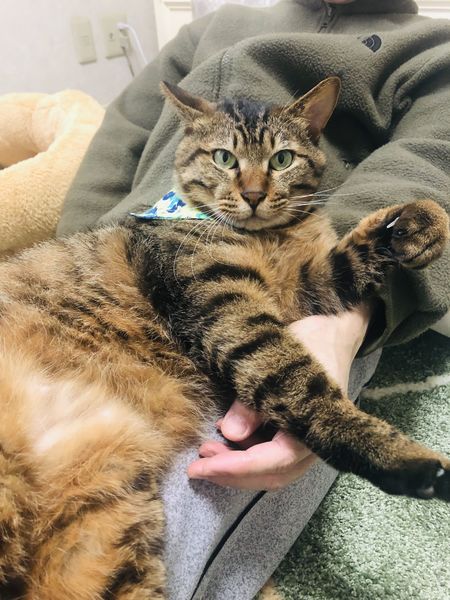 | 特徴(性格など) | キジトラ(オレンジの色味が強い毛色)仔ライオンのような子です。 しっぽは短め。わがままボディの大柄な猫さんです。 とにかく甘えん坊。 保護した当日は、よほど怖かったのか捕獲機の中で暴れまくり、医療ケアをお願いした病院でも「野良気質が強いので、1年ぐらいかけて仲良くなるしかないですね」と言われたほどでした。 少しずつ馴れてもらおうと覚悟をしていましたが、あっという間に陥落してしまい、今では保護部屋に入ると喉をゴロゴロ鳴らしっぱなしで、まん丸の前手をグーパーグーパー、ひたすらエアーふみふみして甘えてきます。 また、人間のお膝に乗るのが大好きで、抱き上げるとグンニャリと脱力しています。 お外にいたときにはできなかったことを取り戻すかのように、おもちゃにじゃれついたり、キラキラボールで遊んだりする様子を見ていると、どれだけお外では孤独で寂しい思いをしてきたのだろうかと切なくなります。 トイレも完璧で、爪研ぎ以外で爪を研ぐこともなく、食事も好き嫌いなく完食で、長い間お外にいたとは思えない優等生であり、健康優良児です。 なお、そんなレオですが、慎重で怖がりの面がありますので、最初の数週間はレオのペースで温かく見守っていただけるとありがたいです。 |