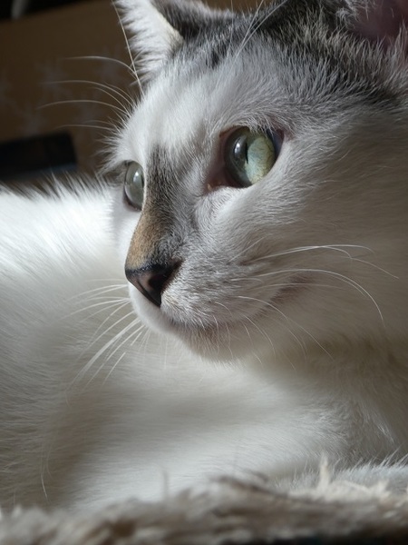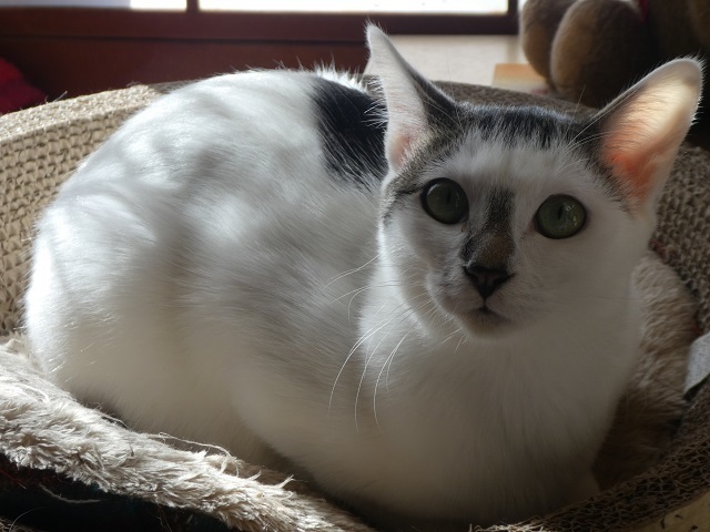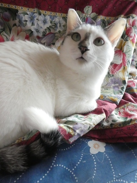 | 特徴(性格など) | 2019年4月下旬ごろ生まれ(仮名 フジコ) 4匹きょうだいでフジコだけがメス。毛色は殆ど白で、頭と背中に1箇所に黒色あり、あとシッポがトラ模様です(シッポの先3センチぐらいは白) 引っ込み思案でおとなしい性格。 いつも兄弟たちの後ろに隠れるようにしていましたが、今では人馴れも進み かなりの甘えっ子に変身しました。 保護した時から威嚇したり爪を出したりはせずに固まるタイプでした。 環境が変わると同じように固まるかと思いますが、見守っていただければ割と早く馴れると思います。 フジコのペースに合わせてお付き合いしていただけるとありがたいです。 いつも活発な兄弟たちにおもちゃを奪われてしまい、思う存分遊んだりできません。 もしフジコを迎えていただいたら、いっぱい いっぱい遊んでやってほしいと思います。 |