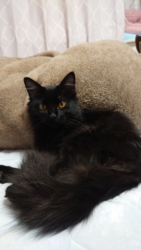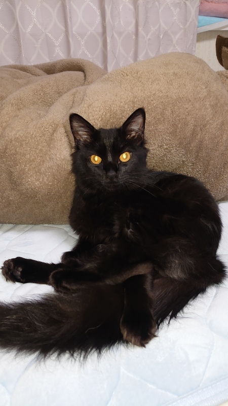| 特徴(性格など) | 中長毛の美猫君 全体的に黒ですが… お腹周りは、シルバー色 ミルクから育てた事もあり、人が大好き! 初対面の人でもスリスリ遊ぼうアピール出来る程です! 我が家の先住猫達とも、問題なく遊んでいます! |