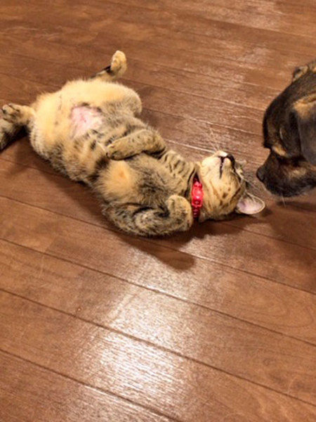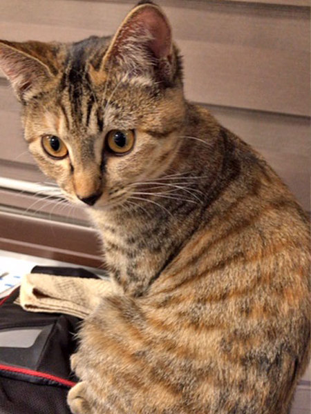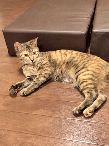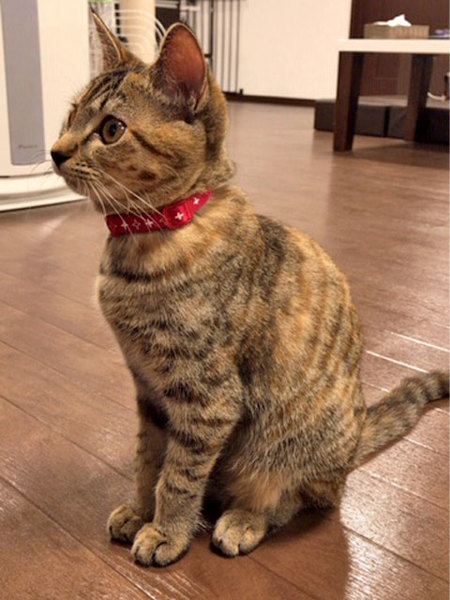 | 特徴(性格など) | 仮名:ひまわり キジ猫 ♀ 推定8月初め生れ 顔が小さく足としっぽが長め 3/5 推定7カ月時点の現在で体重3.2kg 性格は人懐っこく、とっても元気でよく走り回ります。 特にとってこい遊びが大好きで、何回も足元に持ってきます。 また、うちにいる犬たちにも物怖じすることもありません。 |