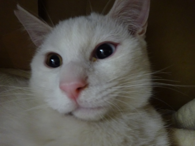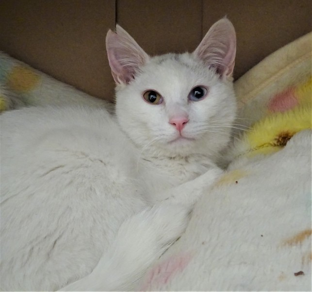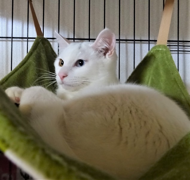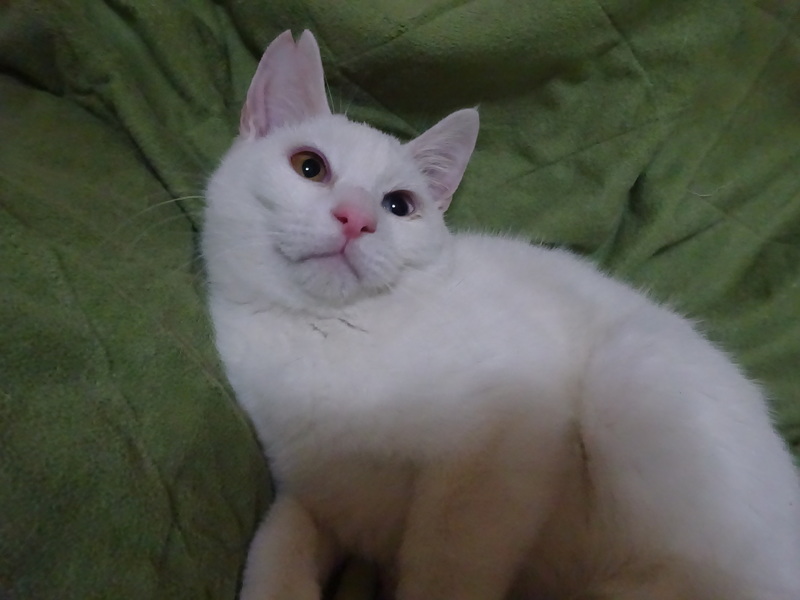 | 特徴(性格など) | 仮名: スノー(オス) 毛色: ほとんど白ですが、頭に薄い八の字模様があります。 目はブルーとブラウンのオッドアイです。 性格: 超ビビリです。 人が来るとワアーと驚く感じで威嚇したりしますが、いつも見ている人にはしません。 攻撃性はないので、怖がっているだけです。 触ったり、抱っこも出来るし、爪切りも出来ます。 他の猫とは、様子をみながら喧嘩なしで付き合えるようです。ケージに入れて様子をみながら、ゆっくり馴らすのをお勧めします。みながら、 怖がって威嚇したりしますので、猫初心者の方よりも経験のある方のほうが良いかと思います。 |