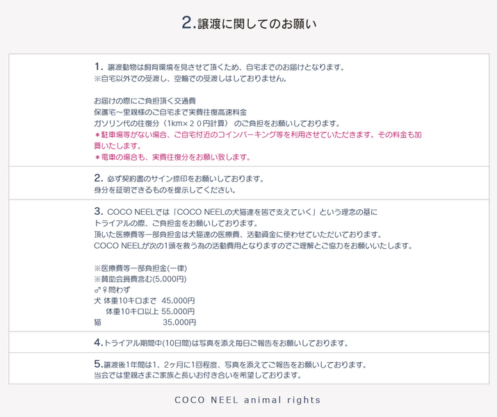 | 譲渡費用(医療費、交通費など) | 医療費負担金 40,000円(去勢手術、ワクチン代他含む) 賛助会員費 5,000円 預かり宅からお届け先までの実費往復交通費をいただきます 詳細はHPでご確認ください。 |