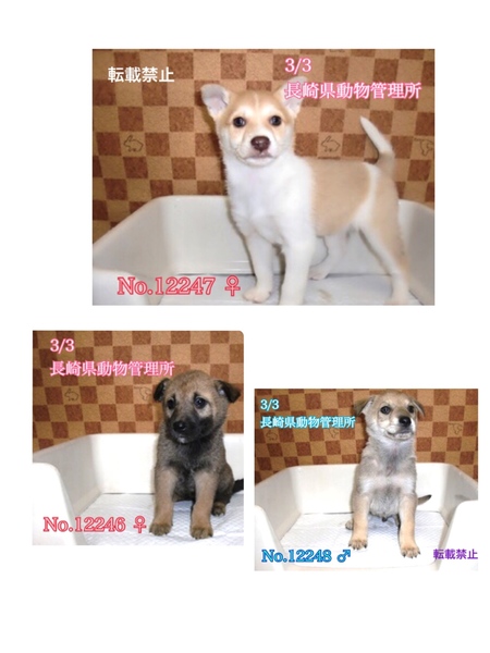 | 特徴(性格など) | まだよちよち歩きの生後2ヶ月位、可愛い可愛い雑種の子犬兄妹達、男の子1匹、女の子2匹ですฅ•ﻌ•ฅ 長崎県諫早市の保健所に、生まれて飼えないからと無責任な飼い主により持ち込まれ、管理所へ収容されました。 寂しく助けを待っています!(5兄妹で持ち込まれましたが2匹は早々と里親様が決まり譲渡になりました)あと3匹です。 まだまだ幼い為、長時間のお留守番は出来ません。頻回に離乳食を小分けにして与える事が可能な方、排泄も頻回なので育てる自信と理解、覚悟のある方、飼育経験のある方 が望ましいですm(_ _)m 人に馴れていてとても可愛いですฅ•ﻌ•ฅ♡ 子犬らしさ全開に仲良く遊んだりじゃれあったりとやんちゃに過ごし、疲れたらくっついてスヤスヤと眠っておりますฅ•ﻌ•ฅ♡ 優しい職員さん方が忙しい中、怖くないよ、幸せになれます様にと毎日触れ合いながら、一生懸命にお世話してくださっています。 当分の間はかなり手がかかり大変かと思いますがまだ子犬ですし、人間が愛情をもって長い目で接すれば、この子達ならきっとじきに新しい家庭環境に馴染んでいけると思います(^^) ⭐️必ず室内飼育で、譲渡後に速やかな病院受診、混合ワクチン接種、ノミダニやフィラリア予防、シャンプー、適期に不妊(去勢、避妊)手術をする事が可能な方。 ⭐️まだまだ幼い為長時間のお留守番は出来ません。しばらくは頻回に離乳食を与える必要があります。なるべくお留守番の少ない、沢山優しく触れ合って頂けるご家庭。 ⭐️トイレの躾は1からとなります。まだ子犬なので躾は入りやすいと思われますm(_ _)m 最初は何かと手がかかり大変ですが覚悟と理解で受け入れて下さる方。 ⭐️犬の飼育経験があり愛情を持って犬をしっかり躾することが出来る方、お散歩や運動に充分時間をあてられる方、場合によりトレーニング教室なども視野に入れて考えてくださる方。何卒宜しくお願い致します。 ⭐️優しい先住犬が居るご家庭大歓迎です。 ⭐️親犬不明の為どの位の大きさになるか分かりませんが、中型〜大きめの中型犬程度に成長すると思われます。 以上の点を踏まえ、この子達の置かれた状況、辛い過去もご理解のうえ、全て受け入れ寄り添っていただけるご家庭で可愛がっていただきたいと祈っております。収容されている全ての子は身勝手な人間による被害者であり、何も悪くありません( ; ; ) 家族の一員として生涯大切にしてくださる優しいご家庭とのご縁が結ばれ幸せになれます様に♡ 1日も早く温かな愛情を目一杯注がれながら、元気に幸せに生きてほしいです。人間より遙かに短い生涯です。 冷たく硬いコンクリートの上、檻の中で、命の期限が迫る中、ひたすら優しい素敵な里親様を待ち続けています。 悲しい事にこの世の中、人間に飼われないと犬は生きていく事が出来ません。 捨てる飼い主、探さない飼い主、医療にかけない飼い主、虐待する飼い主…飼い主を選ぶ事も出来ません。 まだまだこれからのこの子達を、生涯大切に可愛がって下さる優しい素敵な里親様、どうかお願い致します。きっと、必ず最高の家族になります! もうこれ以上悲しい辛い目に遭わせたくありません。本当の愛情、温もりを知ってほしい、辛かった分、寂しかった分、まだまだこれからの犬生はのびのびと幸せいっぱいに愛し愛されて、生きてほしいと願っております。家族の一員に迎え、愛ある温かなお家で、これからの生涯を共に暮らして頂けませんか。 何卒宜しくお願い致します(๑•ᴗ•๑)♡ ◆健康状態 ※管理所では収容するのみ、になり、健康診断やワクチンなどは一切行っておりません。 収容動物の健康面の保証、及びトライアルは無い為、例えどんな病があろうとも全てを受け止め丸ごと受け入れて下さる方、終生愛情飼養して下さる方のみ への譲渡となります事をご理解、ご了承の程何卒宜しくお願い申し上げますm(_ _)m ※譲渡後は必ず速やかに病院でメディカルチェック(血液検査、便検査、混合ワクチン、ノミダニ・フィラリア予防やシャンプー等)適期での不妊手術を確実にお願い致します。 ★去勢、避妊手術は長崎県動物管理所より譲渡条件の1つになります。 ※脱走にはくれぐれもご注意願います。 ⭐︎急に走り出してリードから手を離してしまった、首輪や胴輪が抜けてしまった、一瞬の隙をついて開いたドアの隙間から飛び出して行ってしまった、大きな物音に驚いて脱走してしまった、というケースもございます( ; ; )交通事故等、命に関わります! 細心の注意を払い、たすき掛けやダブル、トリプルリードで、 言葉を持たない大事な家族を守る為に、首輪、胴輪には必ず迷子札、鑑札をつけてくださいm(_ _)m https://wanchan.jp/osusume/detail/2395 http://psnews.jp/dog/p/45558/ https://light-comes-in.jp/dog-doublelead/ ⭐︎管理所にてノミマダニ駆虫のマイフリーガード滴下済みです。 ◆ワクチン接種、去勢手術の有無 未接種 未避妊 未去勢 |